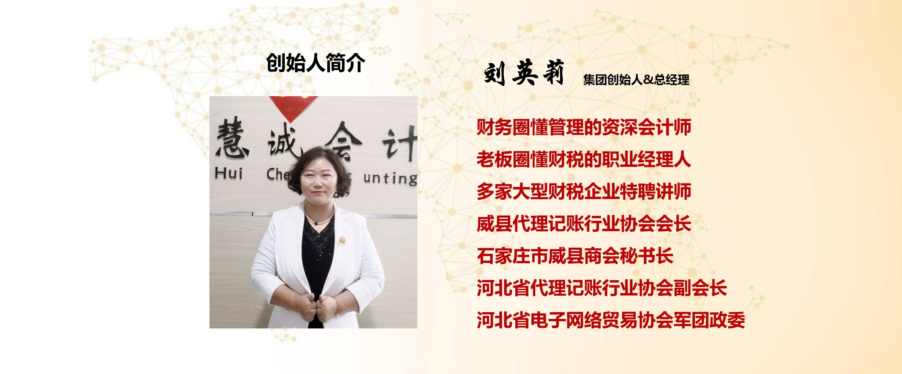 创始人刘英莉女士是“多年实战经验会计师,懂管理的企业经理人”,是多家财税软件企业及行业协会的在聘讲师,是多家规上装备制造企业.建筑及外贸企业的常年财税顾问。